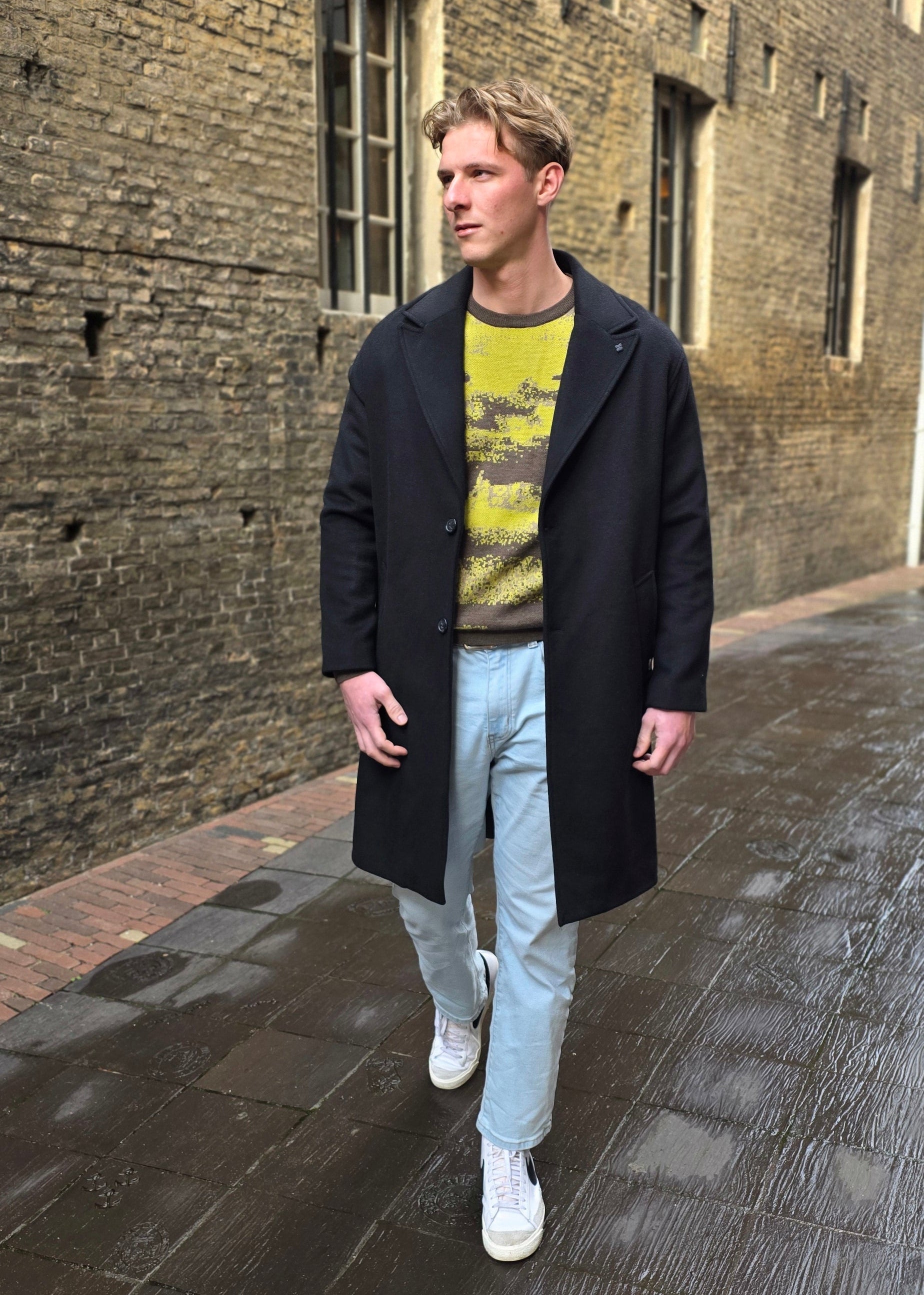 Een zachte, warme trui met karakter. Deze wolblend trui met acid-stijl patroon in aardetinten vangt het gevoel van het seizoen — rust, warmte en verfijnde nonchalance.